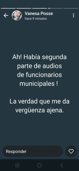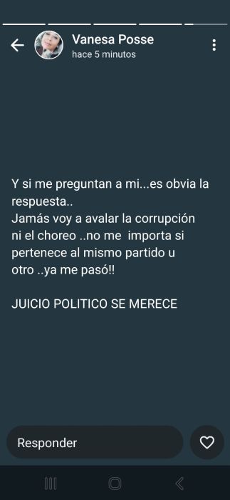 La Concejal Vanesa Posse fue la única que se manifestó a través de su perfil de Whatsaap (captura abajo) con una mención a lo que sucede en la localidad portuaria.