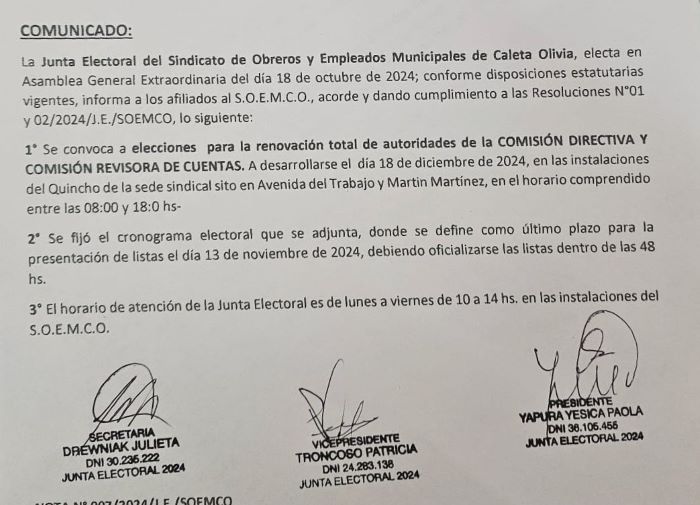 La Junta Electoral del Sindicato de Obreros y Empleados Municipales de Caleta Olivia, electa en Asamblea General Extraordinaria del día 18 de octubre de 2024; conforme disposiciones estatutarias vigentes, informa a los afiliados al S.O.E.M.C.O., acorde y dando cumplimiento a las Resoluciones N°01 y 02/2024/J.E./SOEMCO, lo siguiente: