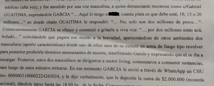 El denunciante quien fuera privado de su libertad por los delincuentes en un domicilio donde se presento mediante engaños asegura en la denuncia que el Secretario de Obras Publicas del municipio de las Heras Gabriel Guaitima lo amenazo solicitándole una suma de dinero según consta en la denuncia policial.