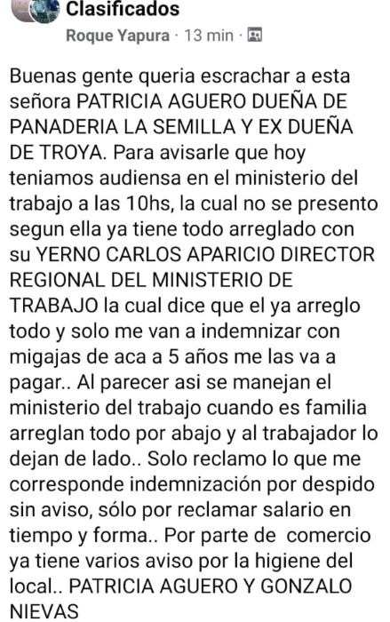 Se suman denuncias en contra del accionar del Ministerio de Trabajo provincial donde una vez mas el cuestionado Director Regional Zona Norte Carlos Aparicio es denunciado por un trabajador, por … Sigue leyendo MINISTRO “LALO” CAMINO Y CARLOS APARICIO EN UNA “TRANZA” CONTRA EMPLEADO DE UNA PANADERIA DE CALETA OLIVIA.
