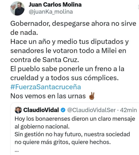 “Hace un año y medio tus diputados y senadores le votaron todo a Milei en contra de Santa Cruz”, expresó Molina en sus redes sociales, minutos después de que el mandatario provincial, usara su cuenta de X para realizar un descargo en el que intenta despegarse del Presidente, tras conocerse su derrota.