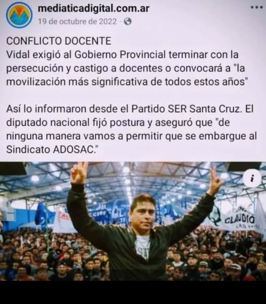 El gremio de Judiciales repudió enérgicamente la multa millonaria de $13.842 millones impuesta al sindicato docente ADOSAC. “Este ataque es ilegal, antisindical y disciplinador, y busca quebrar la lucha por salarios dignos y por una educación pública de calidad”, expuso el gremio a través de la red social de Facebook, tras conocerse en la jornada de hoy, un nuevo atropello del Gobierno Provincial contra el gremio docente. En este sentido, manifestaron que: “Lejos de garantizar imparcialidad, el propio Ministerio de Trabajo provincial —que debería ser árbitro en los conflictos laborales— actúa como parte interesada, castigando a quienes ejercen un derecho constitucional”. La OIT, a través de sus convenios internacionales ratificados por Argentina, establece que sancionar a un sindicato por ejercer el derecho a huelga constituye una violación grave a la libertad sindical (Convenio 98 y principios de libertad sindical). Más adelante, expusieron que: “El sindicalismo es el que sostiene derechos, defiende a los trabajadores y cuida la democracia. Perseguir a un gremio es perseguir a toda la clase trabajadora”. Desde Judiciales “levantamos la voz: ¡La libertad sindical no se negocia, se defiende!”.