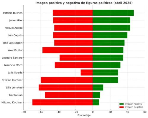 La tabla fue encabezada por la ministra Patricia Bullrich, con un 47,2% de imagen positiva, seguida por el presidente Javier Milei y su vocero Manuel Adorni, ambos con 42,9%.