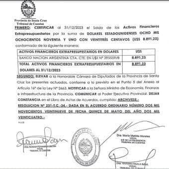 “Dicha actuación da cuenta del Informe presentado por el Ministerio de Economía, Finanzas e Infraestructura de la Provincia de Santa Cruz referido a los Activos Financieros Extrapresupuestarios Año 2023”, indica el documento al que accedió Clarín.