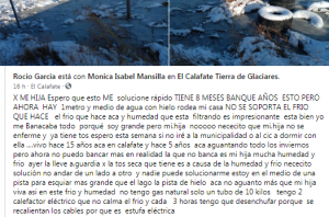 Una vecina a través de las redes sociales amenaza con mudarse al C.I.C o al Municipio porque ya no soporta vivir en medio de una pista de hielo. LEE MÁS: … Sigue leyendo VECINA DE “EL CALAFATE” ABANDONADA POR LA MUNICIPALIDAD AMENAZA CON IRSE A VIVIR AL MUNICIPIO O AL CIC.